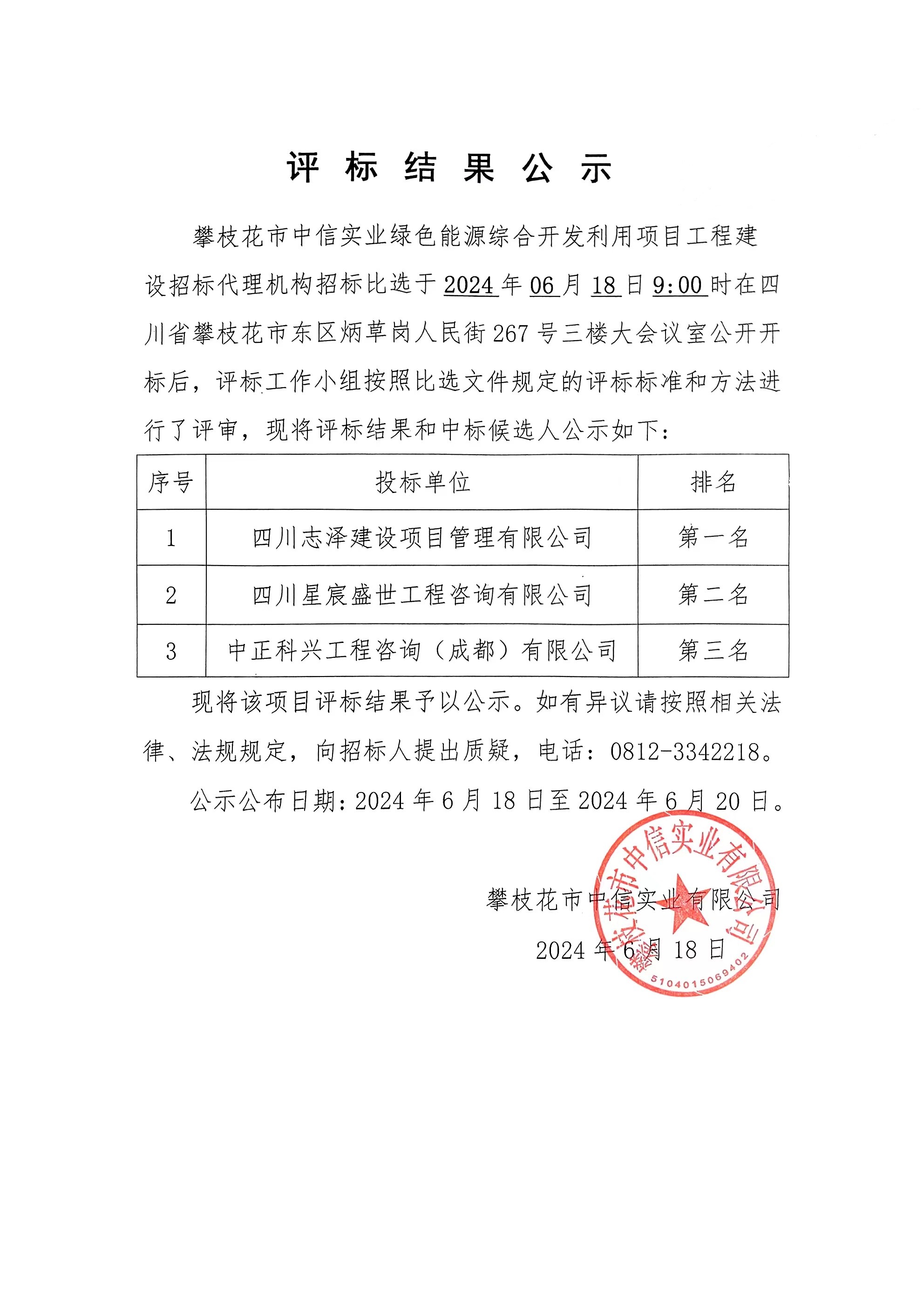 攀枝花市中信實(shí)業(yè)有限公司綠色能源綜合開發(fā)利用項(xiàng)目工程建設(shè)招標(biāo)代理機(jī)構(gòu)招標(biāo)比選評(píng)標(biāo)結(jié)果公示