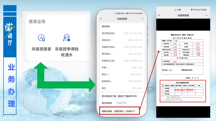 用戶可在報裝業(yè)務(wù)版塊中申請獲得用水。進入報裝業(yè)務(wù)版塊,下載用水審批表,按照示例圖片,完善表格內(nèi)容,再拍照上傳,填寫好相關(guān)信息及附件,提交預(yù)約后,由后臺工作人員接單,進入辦理流程,流程完結(jié),告知申請人是否滿足接水條件,完成報裝申請。