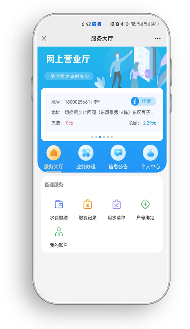 信息公告模塊對公司營業(yè)網(wǎng)點,停水通知,服務(wù)熱線等信息進行公開發(fā)布,后期我們將持續(xù)進行更新。