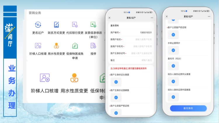 以更名過戶為例,用戶點擊更名過戶功能按鈕,進入提交資料界面,按照頁面提示,填寫相關(guān)信息和拍照上傳附件,提交預(yù)約,后臺管理人員審核通過,便完成更名過戶辦理,用戶無需再到營業(yè)大廳線下辦理任何手續(xù)。